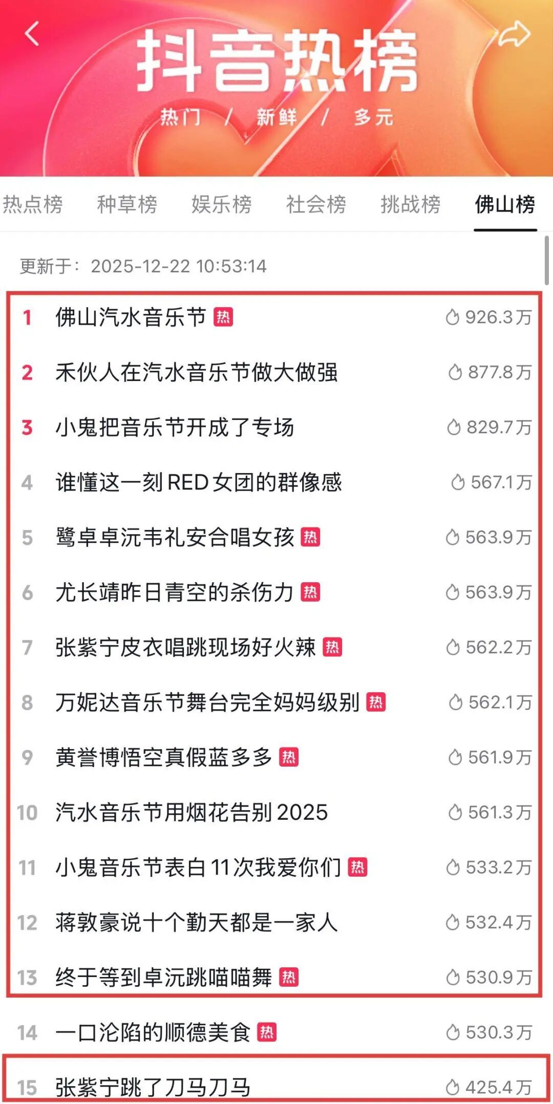 据统计,仅“佛山汽水音乐节”主话题在抖音平台收获浏览量约3.5亿人次。活动期间,两天抖音直播数据超2000万,相关话题包揽抖音佛山热榜前十五中的十四席。其中,第一天#佛山汽水音乐节#佛山汽水音乐节歌单 2个话题霸占抖音佛山热榜首位,#禾伙人在汽水音乐节做大做强#小鬼把音乐节开成专场#谁懂这一刻RED女团的群像感 等衍生话题更是频频刷新抖音佛山热榜,收获“屠榜式”高人气,仅抖音平台一天观看超6000万人次。